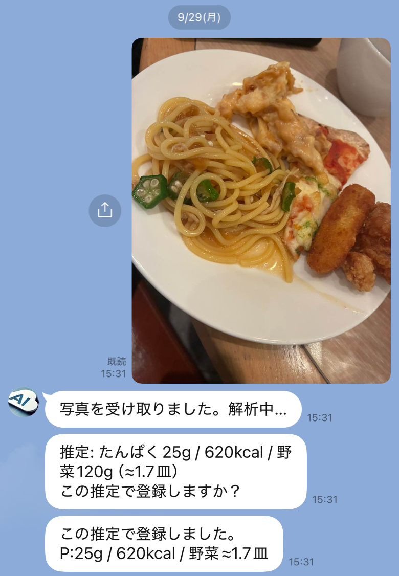 LINEで食事写真を送ると、AIが要約して〈野菜・たんぱく質・kcal〉の目安を返信。